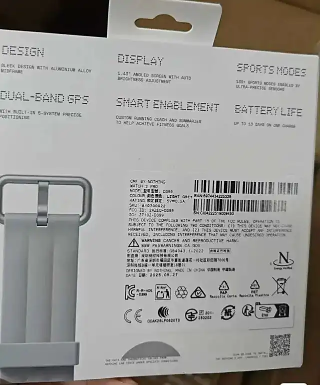 此次泄露的零售包装盒为浅灰色版本,Nothing Watch 3 Pro 的型号为“D399”(宝可梦排名#0399 是 Bidoof)。